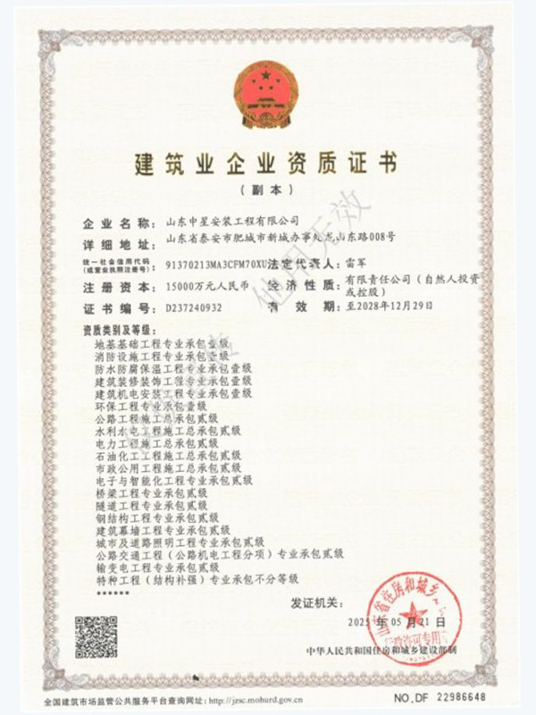 濱州市豁達工程安裝有限公司成立✘于2016年(nián),坐(zuò)落于泰山(shān)西(xī)麓,美(měi)麗(lì)的(de)建築安裝之鄉(xiāng)肥城(ché•ng)市(shì)。 注冊資金(jīn)1.5億元,現(xiàn)有(yǒu)機(jī)∑電(diàn)工(gōng)程施工(gōng)總承包壹級、消防設施工(gōng)程專業(yè)承包壹級、防水©(shuǐ)防腐保溫工(gōng)程專業(yè)承包壹級、建築裝修裝飾工(gōng)程專業(yè)承包壹級、建築機(jī)電(diàn)安裝±工(gōng)程專業(yè)承包壹級、環保工(gōng)程專業(yè)承包壹級、公路(lù)工(gōng)程施工(gōng)總承包貳級、建築工(gōng)程施工(gōng)總承包壹級、水(↓shuǐ)利水(shuǐ)電(diàn)工(gōng)程施工(gōng)總承包貳級、電(diàn)力工(gō£ng)程施工(gōng)總承包貳級、石油化(huà)工(gōng)工(gōng)程施工(gōng)總承包貳級、市(shì)政公用(yòng)工(gōng)程施工(gōngδ)總承包貳級、地(dì)基基礎工(gōng)程專業(yè)承包壹級、電(diàn)子(zǐ)與智能(nén$g)化(huà)工(gōng)程專業(yè)承包貳級、鋼結構工(gōng)程專業(yè)承包貳級、建築幕牆工(gōng)程專業(yè)承包貳級、公路(<lù)交通(tōng)工(gōng)程專業(yè)承包貳級、輸變電(diàn)工(gōng)程專業(yè)承包貳級、城(chéng)市(sλhì)及道(dào)路(lù)照(zhào)明(míng)工(gōng)程專業(yè)承包貳級、特種工(gōng)♥程專業(yè)承包、模闆腳手架專業(yè)承包及施工(gōng)勞務;承裝(修、試)電(diàn)力許可(kě)貳級、鍋®爐A、壓力管道(dào)(GB1.GB2.GC1)、化(huà)工(gōng)裝置拆除等資質。 公司目前已在30餘省、自(zì)治區(qū)和(®hé)直轄市(shì)辦理(lǐ)施工(gōng)備案,施工(gōng)足迹遍布全國(guó),被認可(kě)為(wèi)AAA級信用(yòng)企業(yè)、重→合同守信用(yòng)企業(yè)、誠信經營守信用(yòng)企業(yè)。榮獲“年(nián)度建築安裝業(yè)優質企業(yè)”“年(nián)度優秀分(fēn)包商”“城(chéng)市(shì)建設示範單位”“國(guó)家(jiā)安全生(shēng)産标準化(huà)壹級企業(yè)”等多(duō)個(gè)獎項。 自(₽zì)成立以來(lái),不(bù)忘初心使命、堅定理(lǐ)想信念,始終堅持客戶至上(shàng)、互相(xiàng)成就(jiù)的(de)價值觀;始終堅持求真務實、百煉成鋼的(de)信₩念;始終堅持腳踏實地(dì)、敢打敢拼的(de)工(gōng)作(zuò)作(zuò)風(fēng),放(fàng)眼全國(guó),以專業(yè)、高(gāo)效、真誠、簡潔的(de)團隊積≤累起卓越的(de)市(shì)場(chǎng)口碑,赢得(de)了(le)業(yè)主和(hé)客戶的(de)一(yī)緻好(hǎo)評與信賴。 長(cháng)風(fēng)破浪會(huì)有(yǒu)時(shí),直挂雲♦帆濟滄海(hǎi)。踏實肯幹的(de)中星人(rén)意氣風(fēng)發,勇往直前,堅定理(lǐ)想信念,合作(zuò)共謀發展。山(shān)東(dōng)中星期待與您攜手™,一(yī)同在祖國(guó)建築市(shì)場(chǎng)的(de)沃土(tǔ)中砥砺奮進! ◆品 質 永 無 境 用(yòng) 心 築 未 來(lái)◆