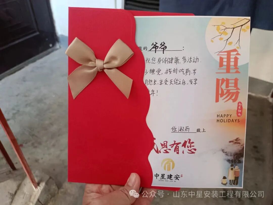 “人(rén)生(shēng)易老(lǎo)天難老(lǎo),歲歲重陽。今又(yòu)重陽,戰地(dì)黃(huáng)花(huā)₹分(fēn)外(wài)香。” 在這(zhè)個(gè)充滿詩意與溫情的(de)重陽節,濱州市豁達工程安裝有限公司展開(kāi)了(le)<一(yī)場(chǎng)溫暖人(rén)心的(de)慰問(wèn)活動,走訪員(yuán)工(gōng)家(jiā)中 80 歲以上( shàng)的(de)老(lǎo)人(rén),為(wèi)他(tā)們送上(shàng)誠摯的(de)祝福與貼心的(de)禮物(wù)。