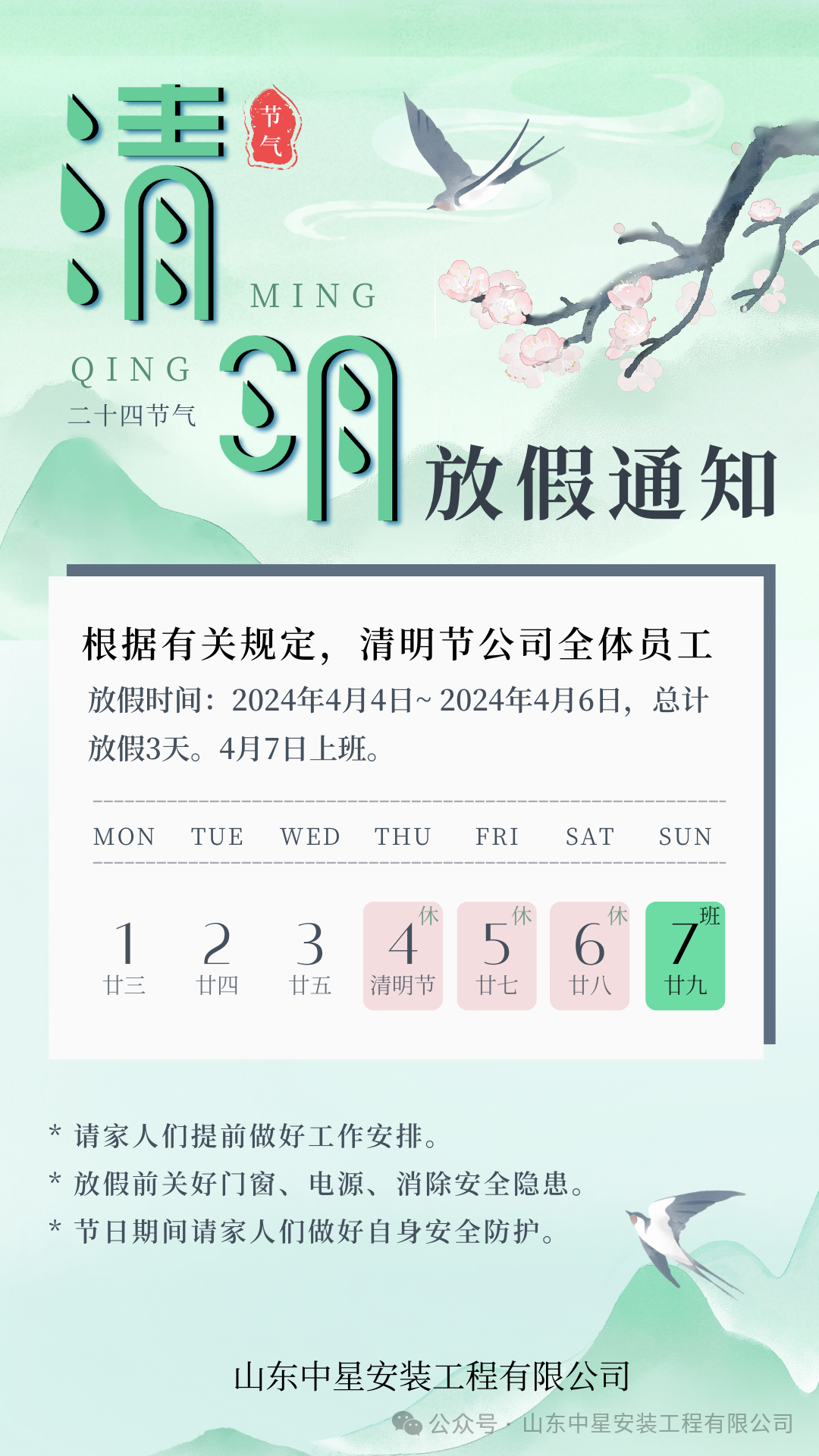 清明(míng)放(fàng)假時(shí)間(jiān):4月(yuè)4日(rì)(星期四 )至4月(yuè)6日(rì)(星期六)放(fàng)假休息3±天,4月(yuè)7日(rì)(星期日(rì))正常上(shàng)班。