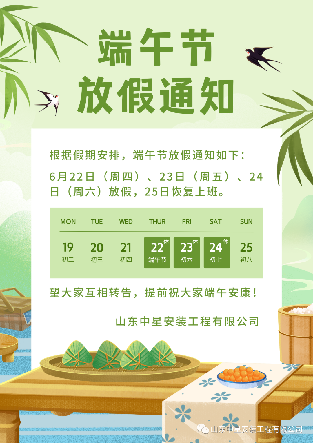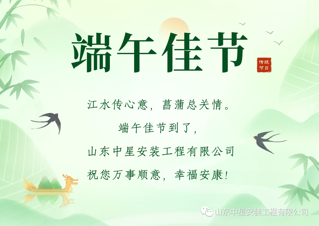 在這(zhè)個(gè)傳統節日(rì)裡(lǐ),濱州市豁達工程安裝有限公司向全體(tǐ₹)員(yuán)工(gōng)、合作(zuò)夥伴以及長(cháng)期以來(lái)關心與支持我們的(de)領導們獻上(shà§ng)誠摯的(de)節日(rì)祝福,祝大(dà)家(jiā):好(hǎo)運“粽”在身(shēn)邊,幸福常≠在“舟”圍,端午安康!